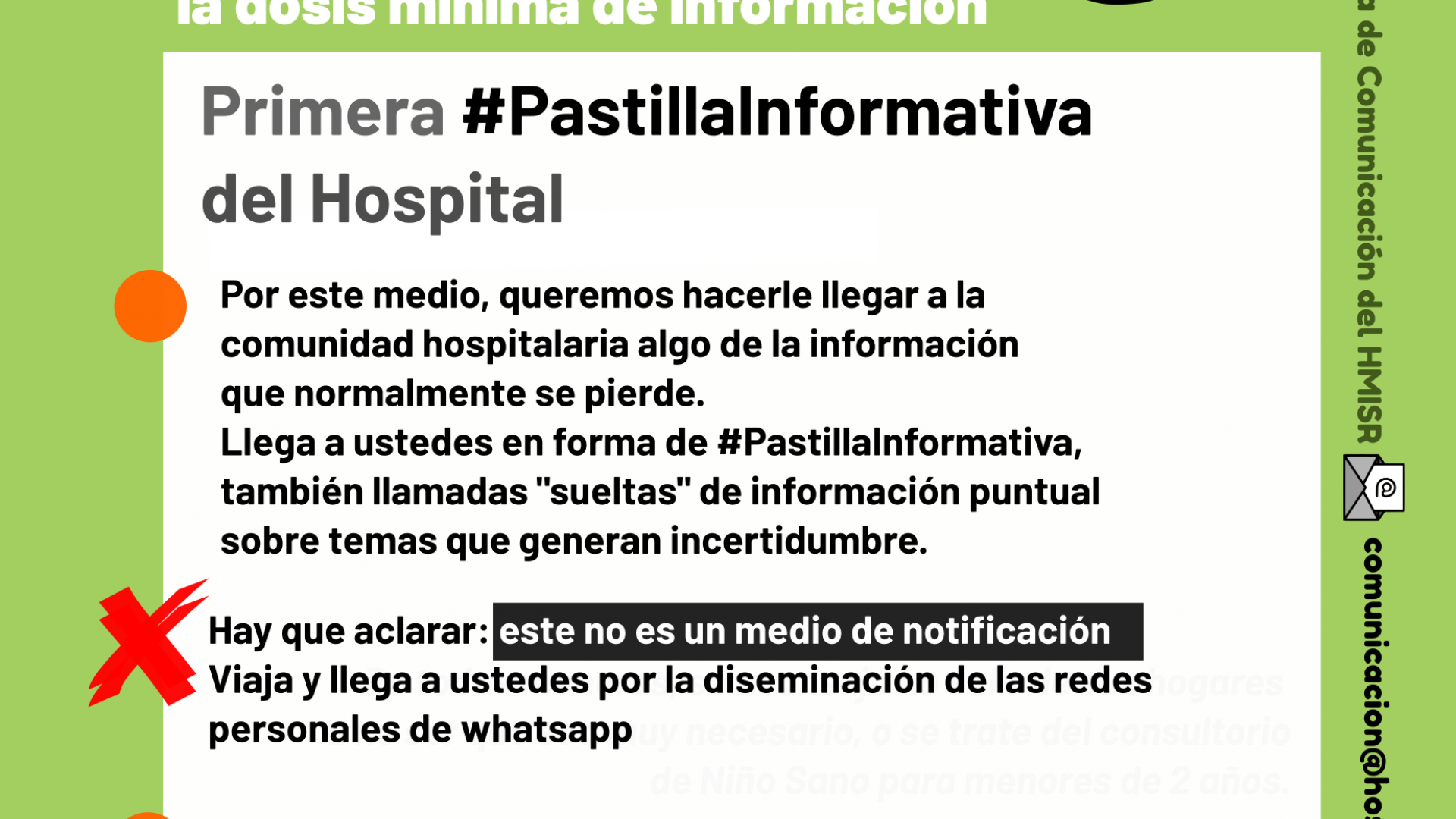 Ante la necesidad de ir sosteniendo, generando y articulando canales de comunicación institucional para llegar a todo el personal del Hospital se pensó en la posibilidad de generar piezas gráficas de circulación informal por whatsapp con información concreta y lo más brevemente formulada.